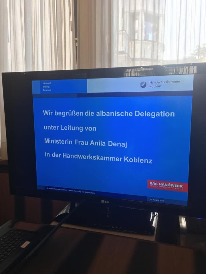Ministrja e Financave dhe Ekonomisë znj. Anila Denaj zhvilloi një takim zyrtar në Dhomën eZejtarisë Koblenz Gjermani. Sot delegacioni shqiptar zhvilloi takim me drejtorin e përgjithshëm të Dhomës së Zejtarisë Koblenz për bashkëpunim midis Dhomës Kombëtare të Zejtarisë Shqipëri dhe Dhomës së Zejtarisë Koblenz. Gjatë këtij takimi pala gjermane prezantoi të gjitha aktivitetet e përbashkëta të kryera nga të dy Dhomat dhe fokusin për të ardhmen. Presidenti i Dhomës Kombëtare të Zejtarisë Shqipëri z. Luan Bregasi dhe Drejtori i Përgjithshëm i Dhomës së Zejtarisë Koblenz z. Ralf Hellrich nënshkruan Marrëveshjen e Bashkëpunimit. Marrëveshja parashikon bashkëpunim institucional, me synim të ndihmojë sektorin e zejtarisë për forcimin dhe profilizimin më tej të Dhomës Kombëtare të Zejtarisë së Shqipërisë në dobi të ndërmarrjeve të vogla dhe të mesme zejtare në Shqipëri dhe në kuadrin e Integrimit evropian. Dhoma Kombëtare e Zejtarisë që në fillimet e saj ka pasur mbështetjen dhe bashkëpunimin e Dhomës së Zejtarisë Koblenz Gjermani, një bashkëpunim i cili ka rezultuar mjaft i sukseshëm deri më tani.